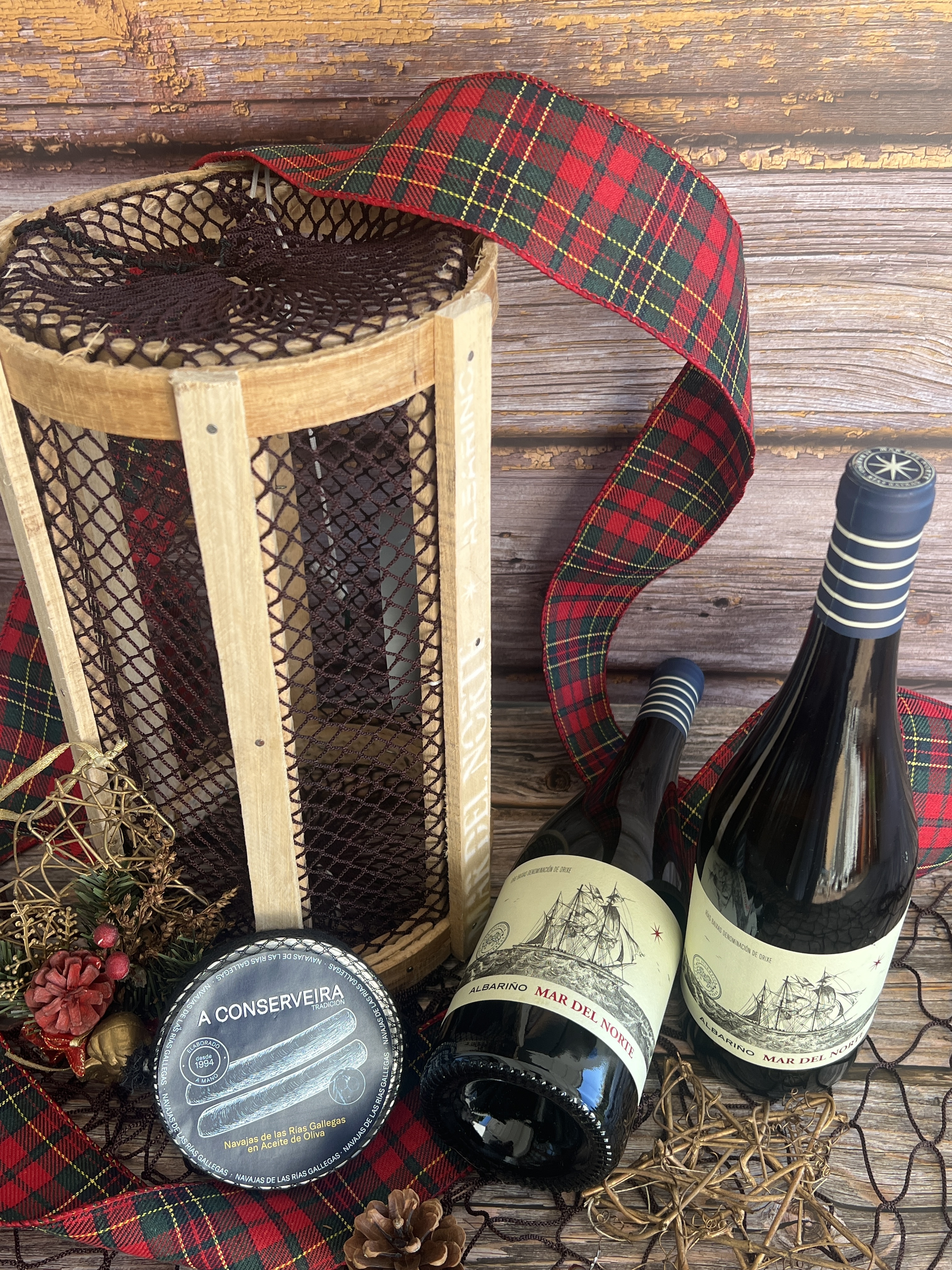 Dentro de esta auténtica nasa pesquera, elaborada por artesanos gallegos, encontrarás un pequeño tesoro del mar y la tierra: 2 botellas de Mar del Norte y 1 conserva gourmet de A Conserveira, una combinación pensada para disfrutar del sabor atlántico en su expresión más pura. Un guiño a nuestra costa, a nuestras raíces y a esa manera tan nuestra de celebrar.